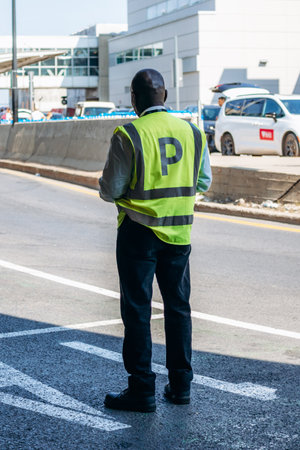 Montreal, Canada - August 10, 2025: Airport staff wearing reflective vest standing near terminal at Montreal-Trudeau International Airport