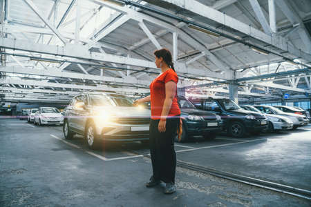 Girl closes car in parking lot in shopping center or mall.