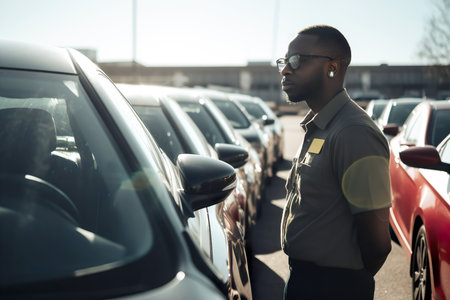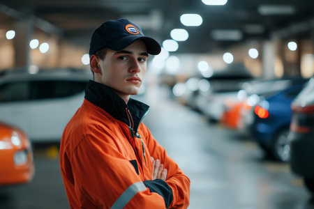 Young man working as a parking attendant in special clothes with cap