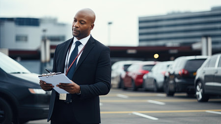 Confident African American businessman holding clipboard and looking away while standing in parking lot