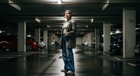 woman walking by mall underground parking winter outfit copy space