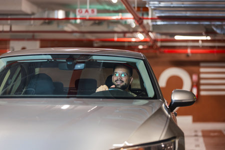 Young businessman searching for parking spot in underground garage. Driving around in his car.