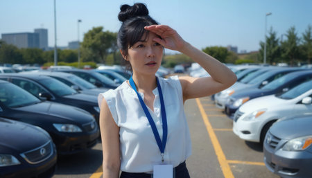 A woman with black hair in a bun, wearing a white shirt and blue lanyard, stands in a parking lot
