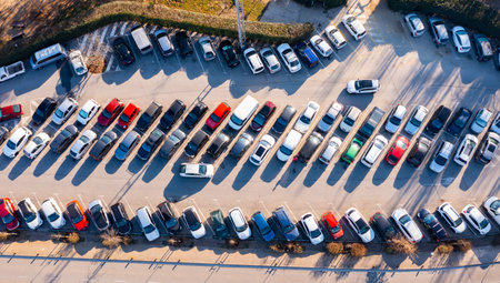 A top-down shot reveals a well-organized huge parking lot filled with various cars. An aerial view showcases various vehicles on urban city parking.