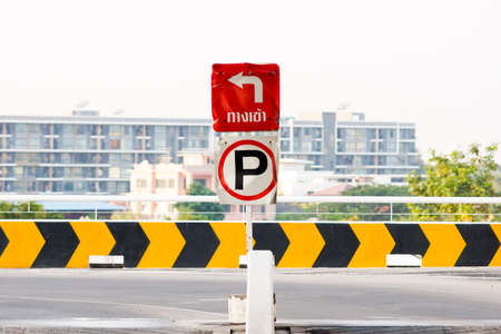 Sign prohibiting parking on the road in the city.
