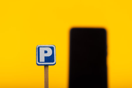In this conceptual image, a wooden parking sign toy is sharply focused with a smartphone out of focus, set against a vivid yellow background for visual impact