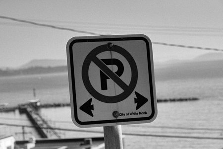 No parking sign on the sea coast. Black and white photo.