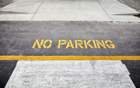 Yellow words no parking painted on the road asphalt.