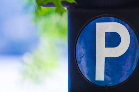 Parking lot sign as symbol of traffic difficulties and transportation issues in busy urban areas of USA. Public paid parking zone in downtown of San Diego, California. Limited space for cars in city.
