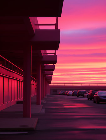 An empty rooftop parking deck at sunset, with warm light reflecting off the concrete and a cityscape in the background