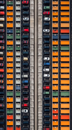 Parking symmetry: An aerial perspective of parked cars forming a symmetrical pattern, exemplifying precision and repetition.