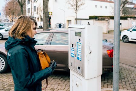 Kehl, Germany - Dec 13, 2016: Woman paying for parking at automated machine meter in large parking