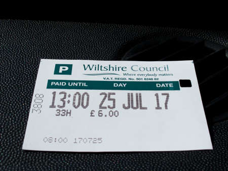 Wiltshire Council pay and display parking ticket on vehicle dashboard showing time, date and fee paid