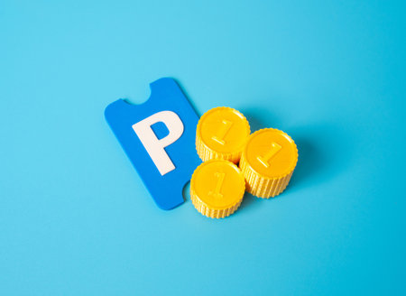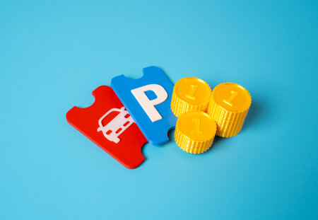 Parking ticket and coins. Payment for parking coupons. Urban transport fees, paid parking zones, short-term city stops. Digital and coin-based meters, fines, the economics of traffic infrastructure.