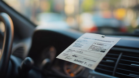 A parking ticket displayed on a car dashboard in a busy urban environment.