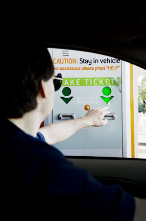 A man in a car drives into a parking lot. Entrance to the paid parking lot