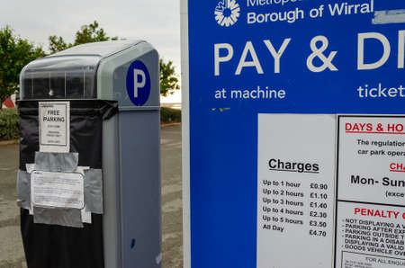West Kirby, UK: Jun 3, 2020: Due to the corona virus pandemic, charging for car parking has been suspended. The payment machine has been covered with black plastic & displays free parking information