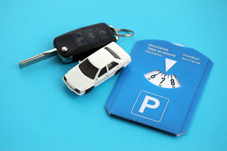 Parking disc for windshield and white toy car with ignition keys. Limited time parking system in european countries. Concept of parking time count in busy parking lots