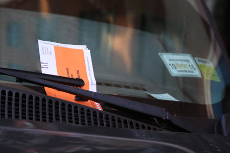 Coventry, UK - August 27, 2018: Generic penalty charge notice (parking fine) attached to windscreen of white car parked on street in Coventry, UK