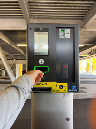 POV male hand waiting for the ticket at the parking meter at entrance of modern Aiport large parking with contril ticket badge - operated by Skidata telecommunication