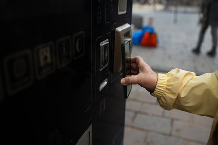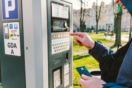 Payment for parking in the City of Gdansk, Poland on February 8, 2020. A person uses monobank credit card for nfc payment in parking terminal. Paid Automatic payment for parking places in city.