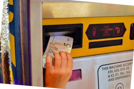 Close up on hand inserting banknote into the machine, time for playing, gaming, buying food or drink. Having fun childhood joyful activity macro background