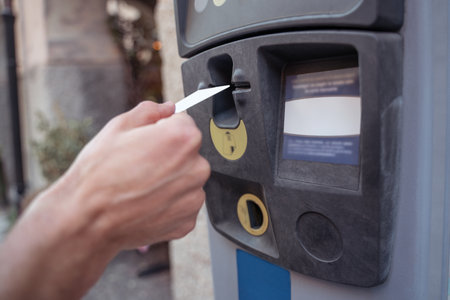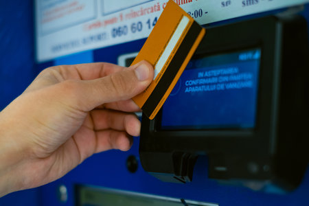 BASEL, SWITZERLAND - MAR 22, 2018: Point of view of male hand taking a credit card out from a parking teller machine after the payment is accepted