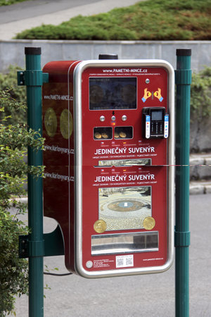 Karlovy Vary, Czech Republic - August 10, 2023: A souvenir machine in central part of world-famous spa resort Karlovy Vary