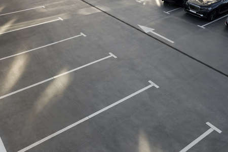 Empty car parking lots aerial top view from drone. Concrete urban background with white lines.