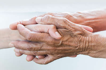 Elderly hand held gently by younger hand showing care and compassion in warm light