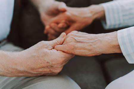 Close-up of doctor holding hand of senior patient and consoling him during medical visit at home.