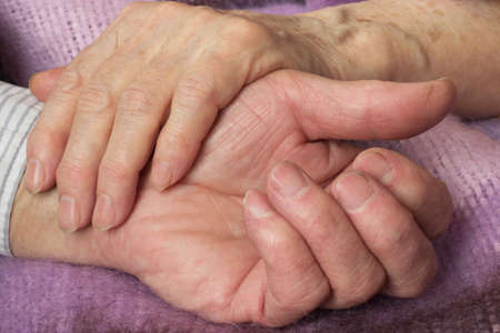 elderly mans hand holds elderly womans hand. tinted color image. horizontal format