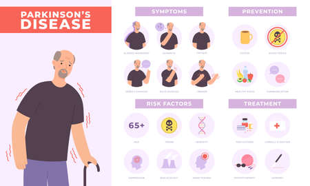 Parkinson disease symptoms, prevention and treatment infographic with old character. Elderly mental health, neurology disorder vector poster
