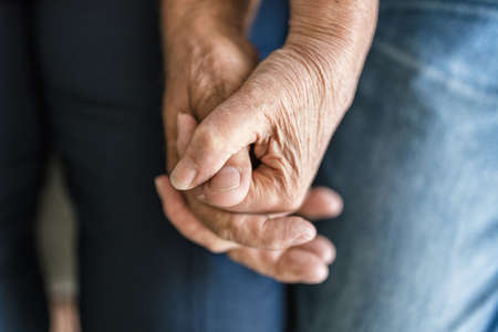 Close up of hand of elderly woman holding hands of old man. Romantic love lasting forever concept