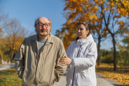 Senior man with a beard and glasses takes a leisurely walk in the park, assisted by a young woman, emphasizing companionship and the importance of elder care.