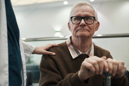 Senior Caucasian man sitting with hands resting on cane, wearing glasses, looking away from camera while medical professional placing reassuring hand on his shoulder in healthcare setting