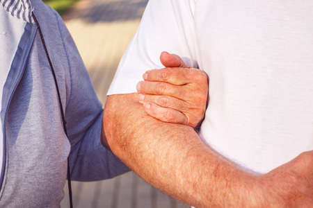 Elderly man has pain in fingers and hands. Old man with finger pain, bokeh background, outdoors
