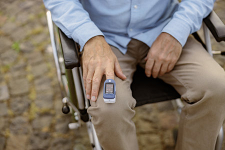 Close up shot of hand of handicapped man in wheelchair using fingertip pulse oximeter for measuring oxygen saturation outdoors during outbreak