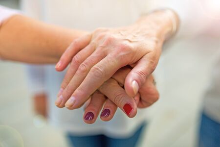 Hands of a mature wife or guardian holding the hands of her elderly woman or patient, as an expression of care and support. Close up photo of a dedicated caregiver holding an elderly woman's hands.