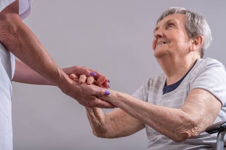 Hand of nurse holding hand of a senior woman