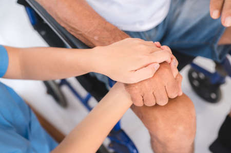 Nurse or caregiver holding the hand of an elderly senior man in wheelchair showing sympathy and kindness