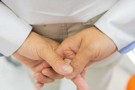 Hand of elderly man with osteoarthritis at doctor's office on white table