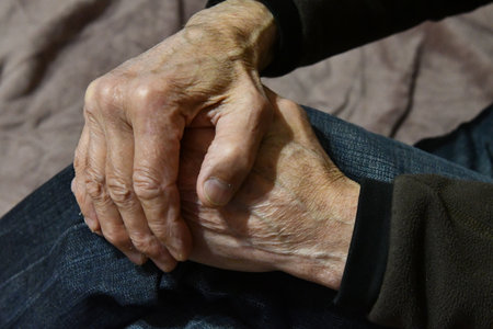 Weathered hands of an elderly person resting on a surface