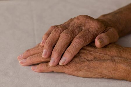 Old wrinkle hands of 93 years old lady, close up, selective focus, series of high resolution photos