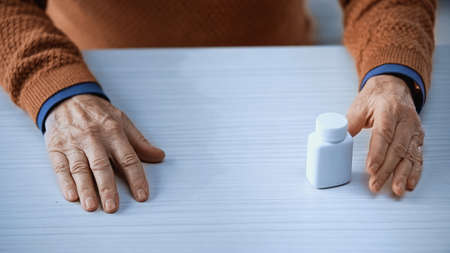 cropped view of medicine jar on table between hands of elderly man on gray background
