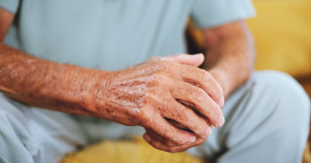 Senior, person or hands with arthritis on sofa in home with osteoporosis, joint pain or closeup of carpal tunnel in retirement. Wrist injury, fibromyalgia or elderly fingers with wrinkles in hospice