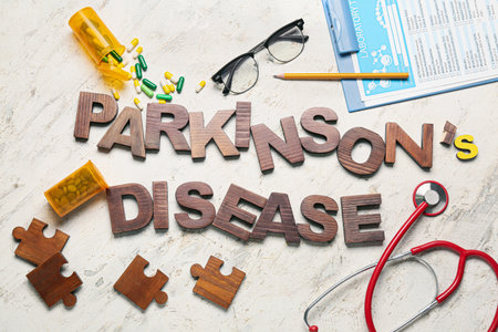 Paper sheet with text PARKINSON'S DISEASE, pills, puzzle pieces and stethoscope on grunge background