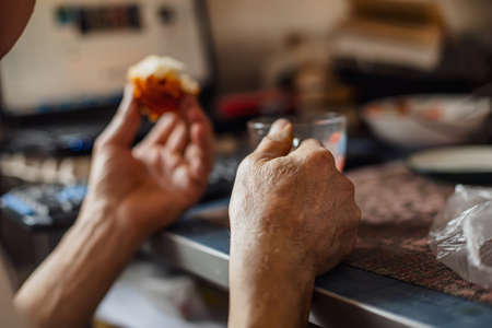 Elderly Hands of old man with age spots and wrinkles holding cup of hot coffee and a sandwich during tea party. senior citizen is having breakfast at home near laptop.