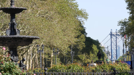 New York City, United States - 3 Sept 2023: Manhattan Bridge to Dumbo, Brooklyn Downtown Columbus autumn park near Borough Hall. USA tourist landmark. Tree leaves, flowers. Henry Ward Beecher Statue.