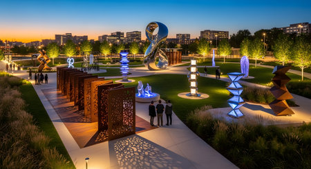 A beautifully lit public park features various modern art sculptures and illuminated pathways at twilight. The urban green space offers a blend of nature and artistic design, with city buildings visible in the distance against a sunset sky.